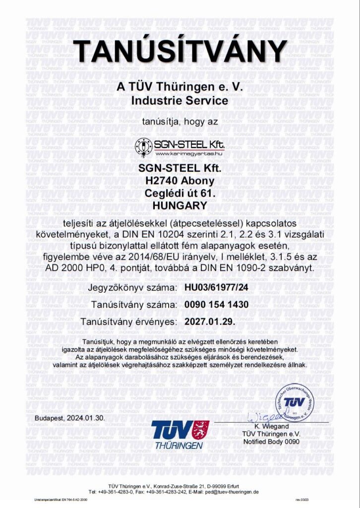 Az TÜV Thüringen átpecsételési tanúsítvány, az ÉMI-TÜV ISO 9001 és ISO 14001, a DNV és a Lloyd’s tanúsítványok követelményeinek való folyamatos megfelelés, illetve egy korszerű vállalatirányítási rendszer bevezetése garantálják az általunk gyártott termékek megfelelőségét.